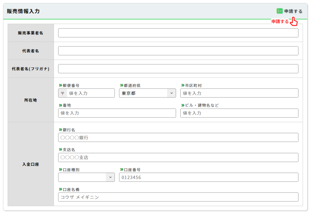 申請画面で必要情報を入力し、「申請する」ボタンをクリックすることで、カード決済申請が完了します。
