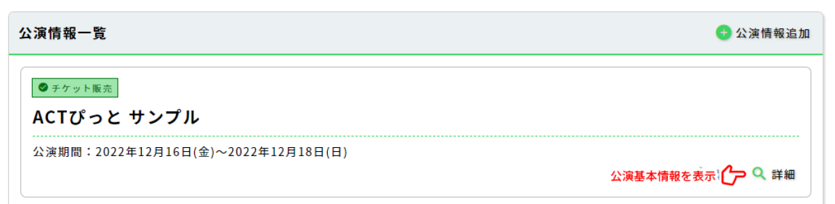 HOME画面の公演情報一覧から「詳細」ボタンをクリックして公演基本情報を表示します。表示された公演基本情報がめのチケット欄から「追加」ボタンをクリックしてチケット情報の追加を行います