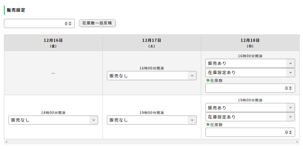 公演情報で設定された各スケジュールのチケット販売を設定します。該当スケジュールの「販売あり」を選択することで、チケットの在庫数を設定できます。「在庫数一括反映」に数量を入力し、ボタンをクリックすることで、全公演の在庫数を一括で反映できます。