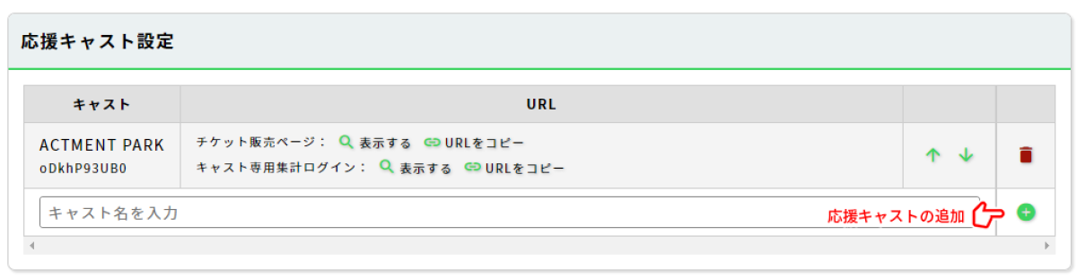 公演基本情報画面の応援キャスト設定欄から、キャスト名入力欄にキャスト名を記入し、追加ボタンをクリックすることで応援キャストの設定を追加できます。応援キャストを追加することで以下の機能を利用出来るようになります。