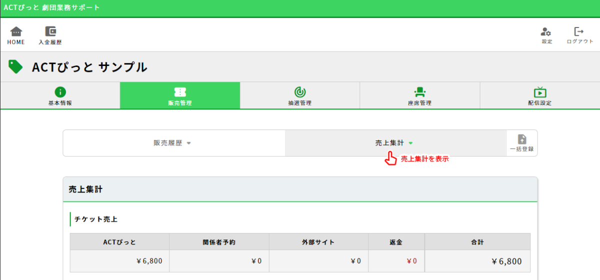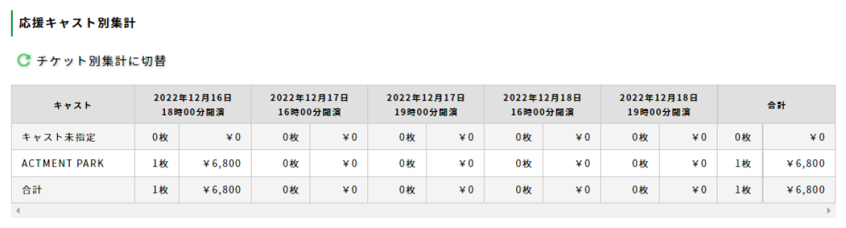 上記集計値の合計を表示します。合計に表示されている金額が当該公演にて発生したACTぴっとの預り金の総合計です。
