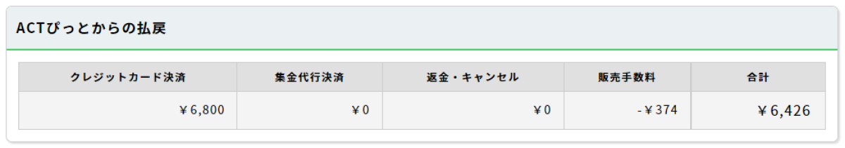 カード決済申請が許可されている場合、「クレジットカード決済」「集金代行」での販売データを集計し、ACTぴっとの預金合計、手数料などを表示します。