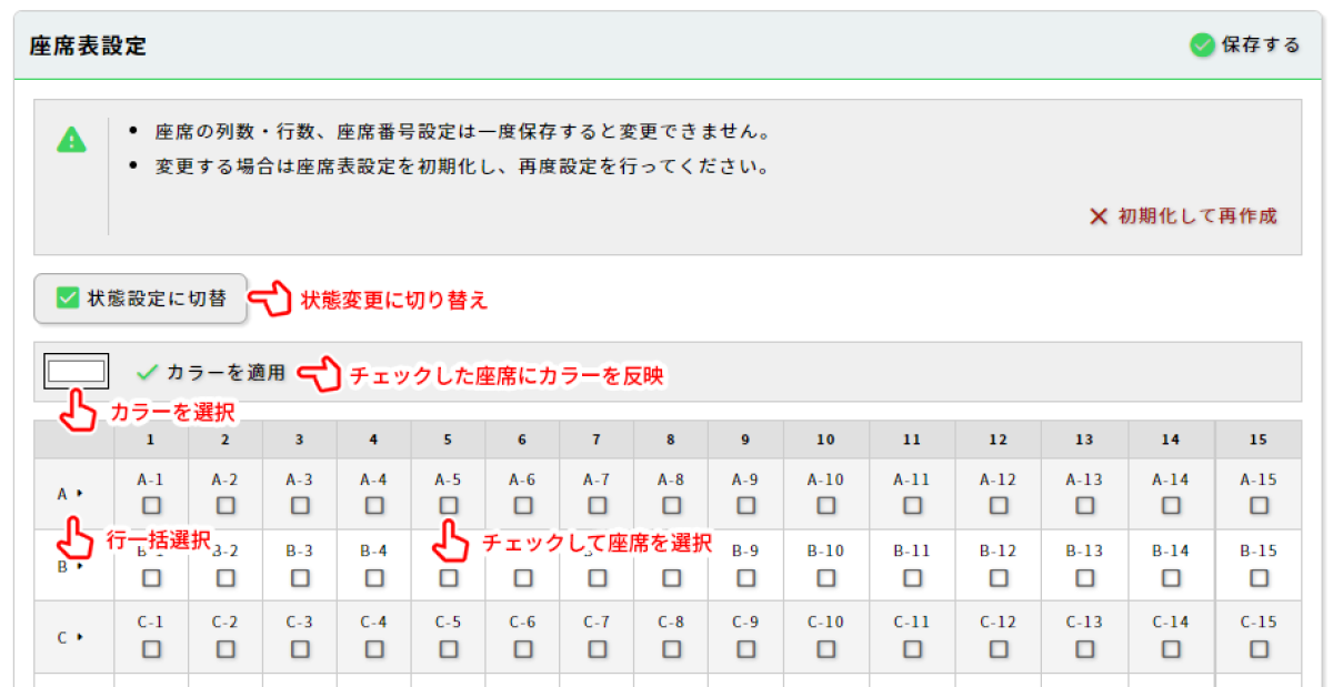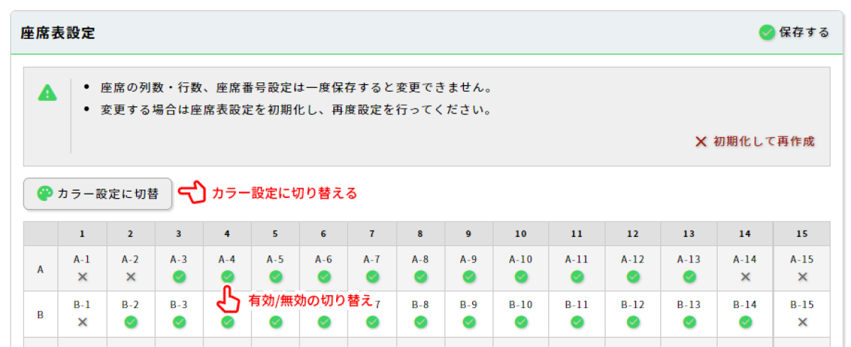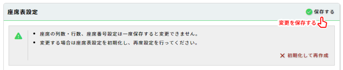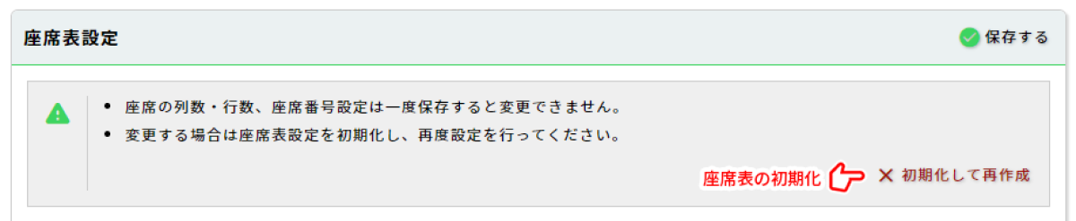 座席表の行列数変更、ラベル変更には座席表の再作成が必要です。「初期化して再作成」をクリックすることで座席表が初期化されます。