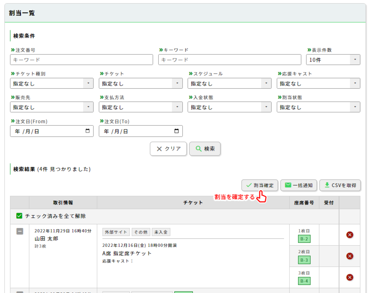「割当確定」ボタンをクリックすることで、割当済み座席の確定処理を行います。同時購入チケットが全て割当てられていないチケットは確定処理が実施されません。