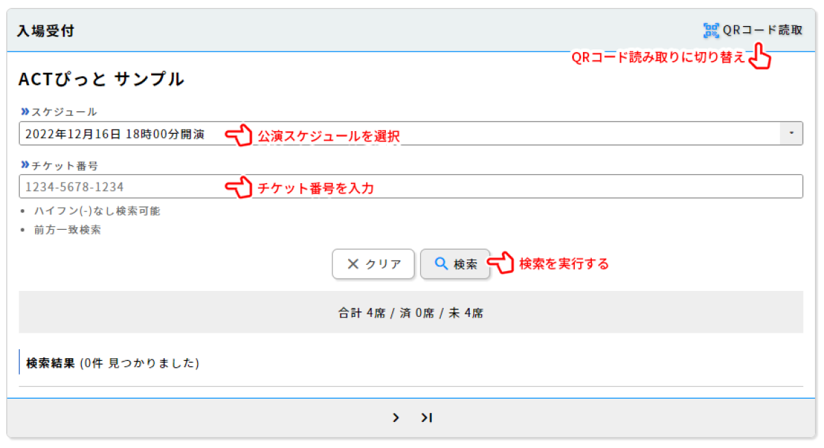 検索に該当するチケットが存在する場合、チケット情報が表示されます。チケット内容、状態が正しいことを確認して「入場受付」ボタンをクリックすることで該当チケットは入場受付済状態になります。