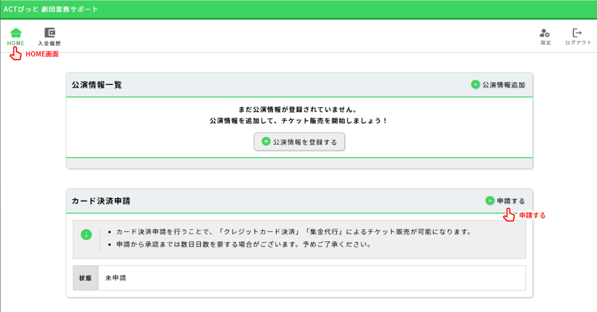 集金代行を利用したチケット販売を行うには、カード決済申請を行っていただく必要がございます。詳しくは「1-2. カード決済申請」をご覧ください。