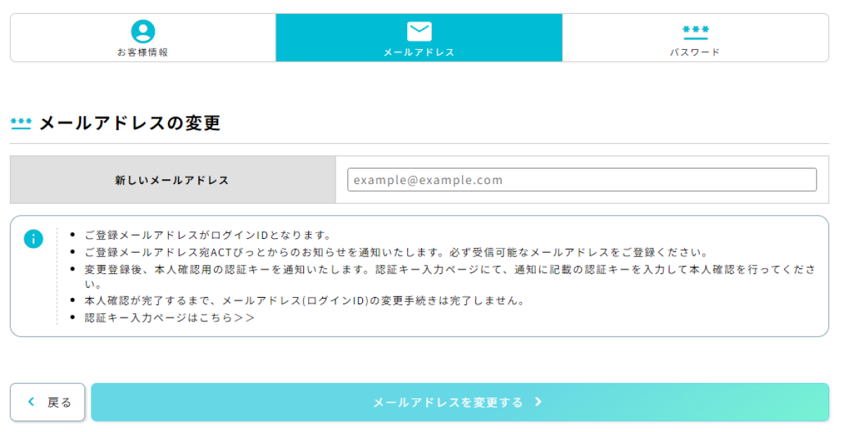 メールアドレス変更通知及び認証キーを登録メールアドレスへ送付します。必ず受信可能なメールアドレスを登録して下さい。